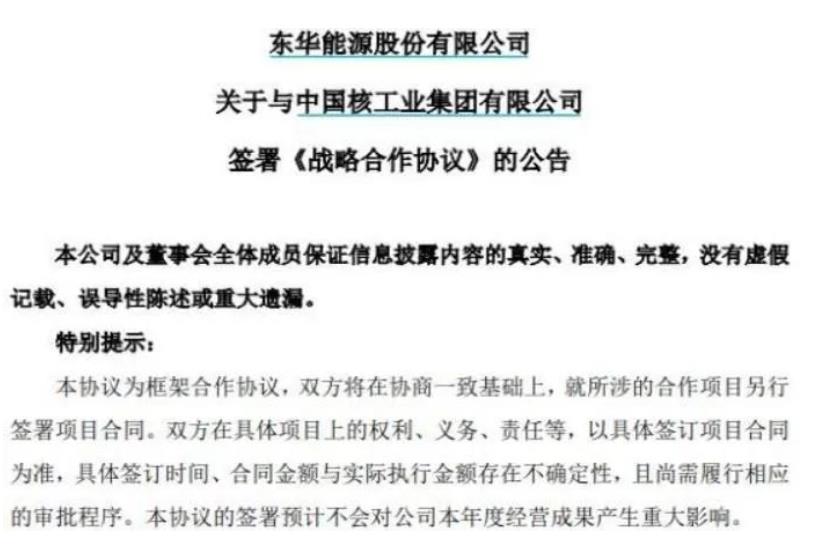 9月6日晚,東華能源發布公告,與中核集團簽署《戰略合作協議》,協議有效期為10年,雙方將在未來五年內預計投資超千億元共同打造零碳產業園,并聯合成立氫能聯盟。