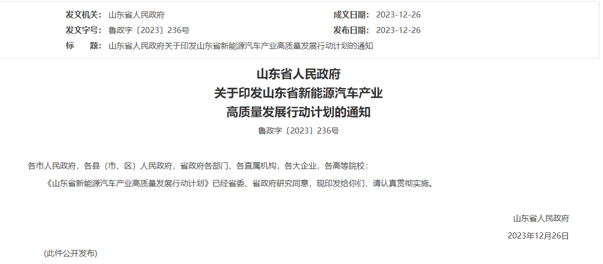 12月26日,山東省人民政府發布關于印發《山東省新能源汽車產業高質量發展行動計劃》的通知。
