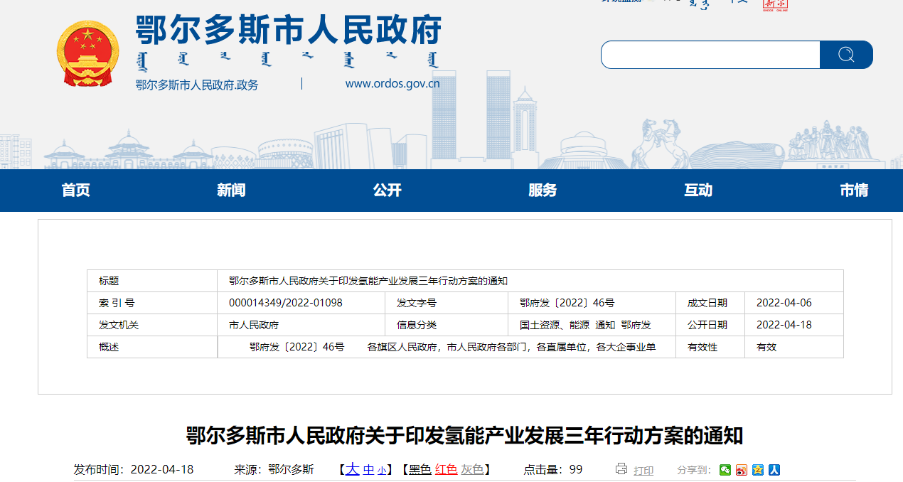 4月18日,鄂爾多斯市人民政府發布了《關于印發氫能產業發展三年行動方案的通知》。到2024年,開展可再生能源制氫示范項目8個以上,通過示范推廣、產業培育和技術攻關,實現鄂爾多斯市氫能裝備產業及綜合應用突破性發展。至2024年,鄂爾多斯市可再生氫產量達20萬噸/每年。至2024年,累計建設加氫站60座,燃料電池車輛推廣超過3000輛,打造5個以上10萬噸級綠色化工項目。