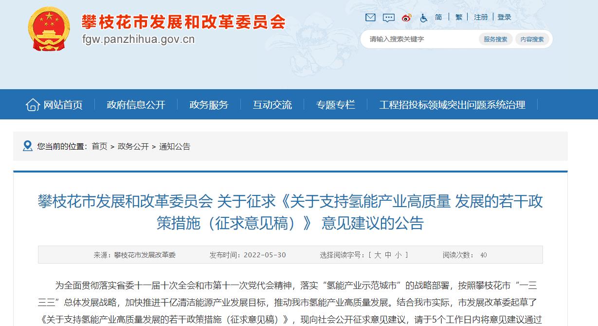 攀枝花市發展和改革委員會 關于征求《關于支持氫能產業高質量 發展的若干政策措施(征求意見稿)》 意見建議的公告