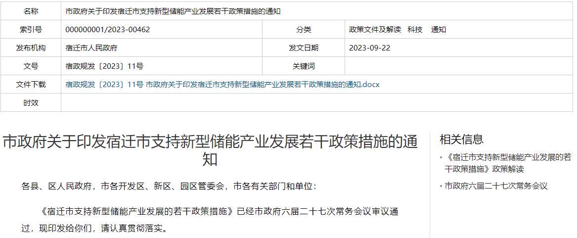 9月22日,為了促進(jìn)宿遷儲(chǔ)能產(chǎn)業(yè)集聚發(fā)展,宿遷市人民政府印發(fā)《宿遷市支持新型儲(chǔ)能產(chǎn)業(yè)發(fā)展的若干政策措施》。