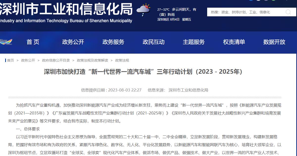 8月3日,為搶抓汽車產業重構機遇,加快推動深圳新能源汽車產業成為經濟增長新支柱,乘勢而上建設“新一代世界一流汽車城”,深圳市工業和信息化局結合實際情況,制定并發布了《深圳市加快打造“新一代世界一流汽車城”三年行動計劃(2023-2025年)》。