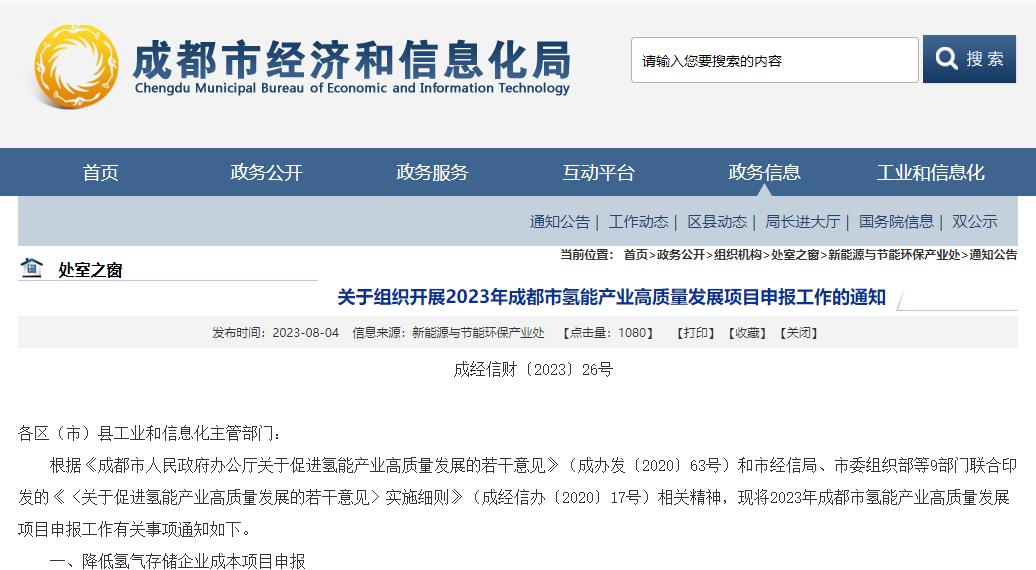 8月4日,成都市經濟和信息化局發布關于組織開展2023年成都市氫能產業高質量發展項目申報工作的通知。