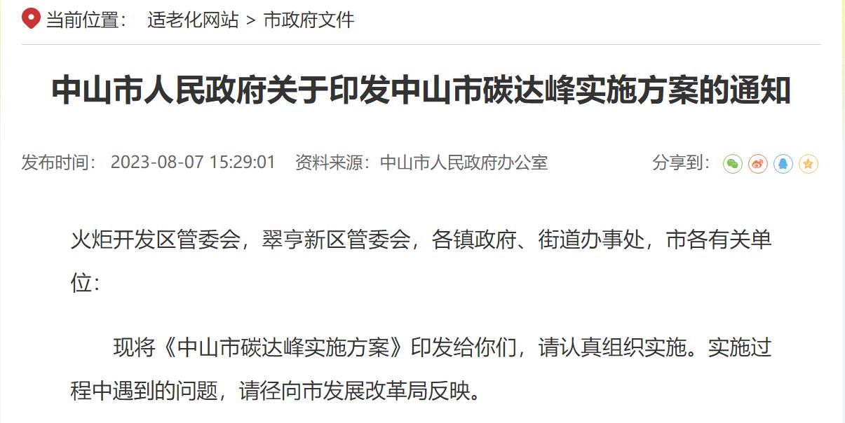 近日,廣東中山市人民政府在其官網發布關于印發《中山市碳達峰實施方案》的通知。