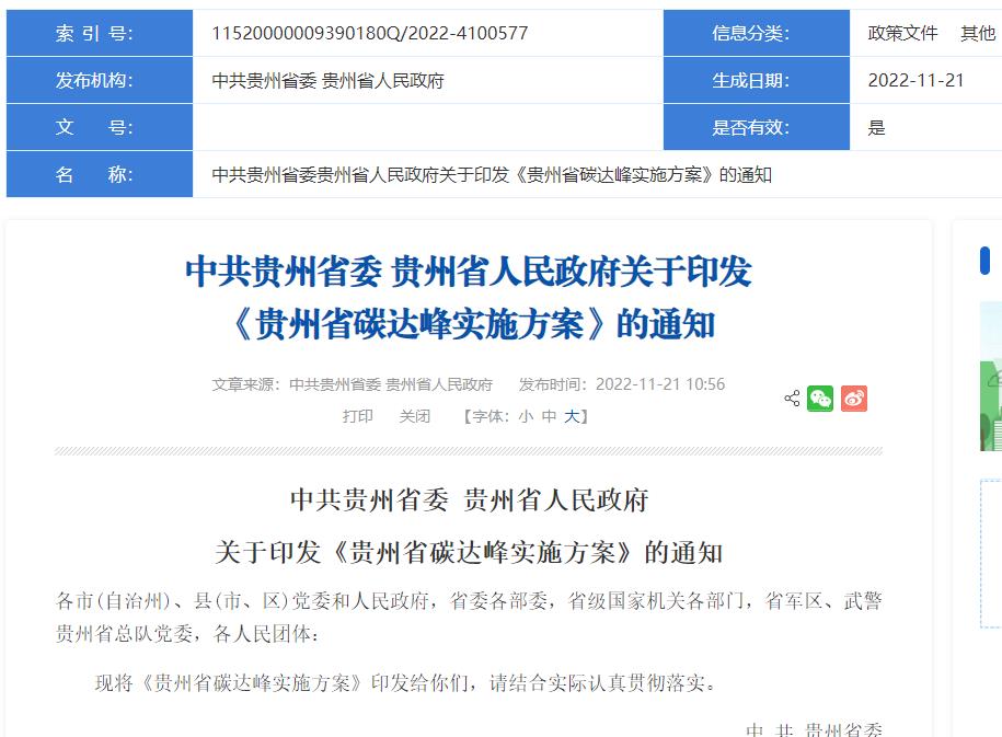 氫啟未來網(wǎng)獲悉,11月21日,貴州省人民政府發(fā)布《貴州省碳達峰實施方案》