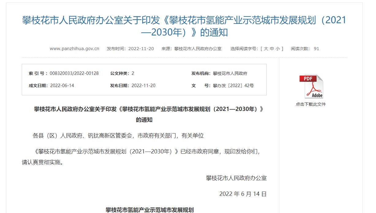 氫啟未來網(wǎng)獲悉,11月20日,攀枝花市人民政府發(fā)布《攀枝花市氫能產(chǎn)業(yè)示范城市發(fā)展規(guī)劃(2021-2030年)》