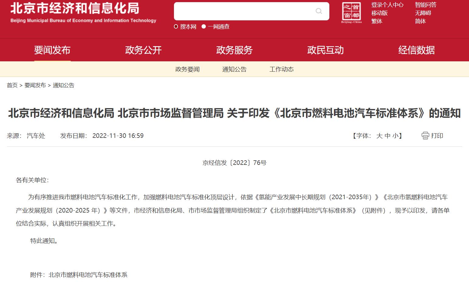 氫啟未來網(wǎng)獲悉,11月30日,北京市經(jīng)濟和信息化局聯(lián)合北京市市場監(jiān)督管理局發(fā)布《北京市燃料電池汽車標準體系》的通知。