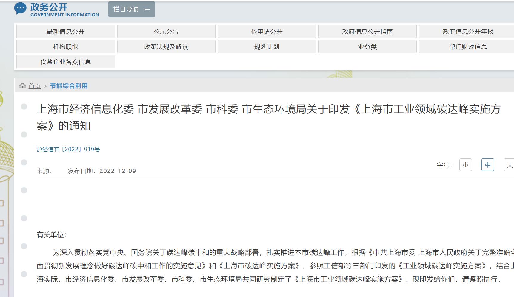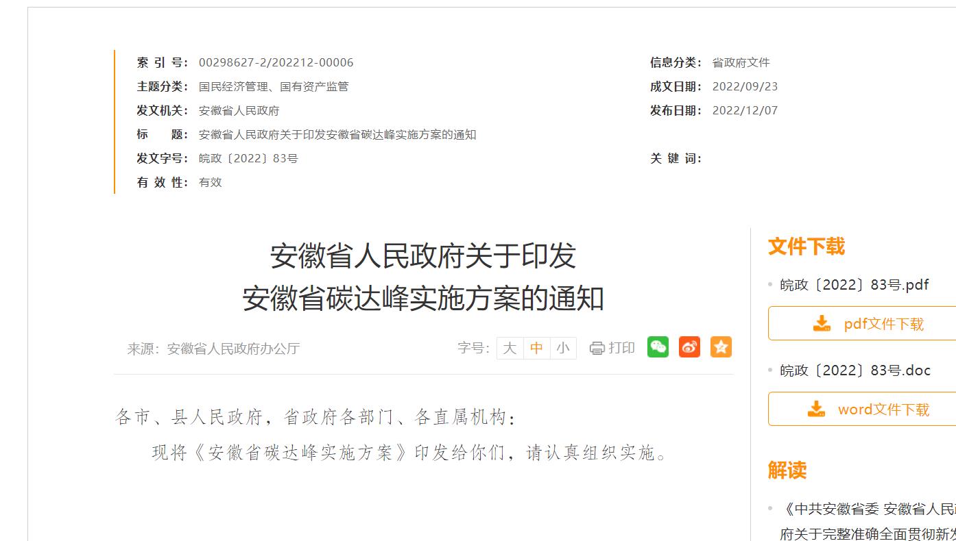 12月7日,安徽省人民政府發(fā)布關于印發(fā)安徽省碳達峰實施方案的通知