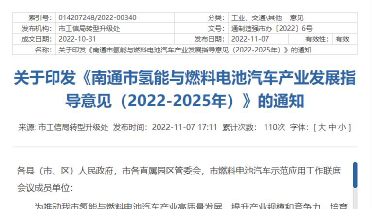 氫啟未來網獲悉,11月7日,南通市工信局轉型升級處發布關于印發《南通市氫能與燃料電池汽車產業發展指導意見(2022-2025年)》的通知。