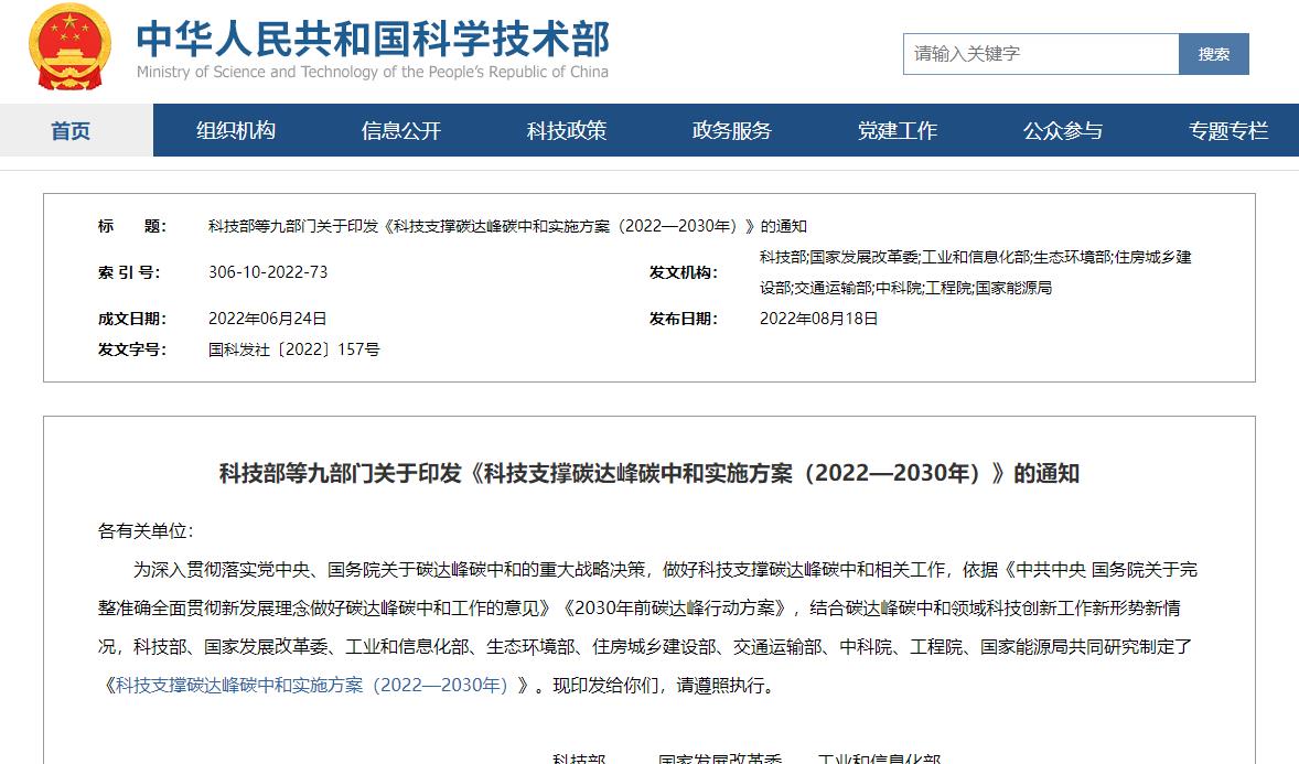 《科技支撐碳達峰碳中和實施方案(2022—2030年)》官方政策解讀
