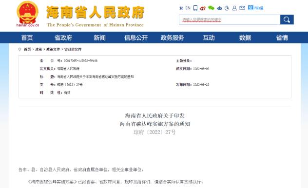 氫啟未來網獲悉,8月22日,海南省發布《海南省碳達峰實施方案》