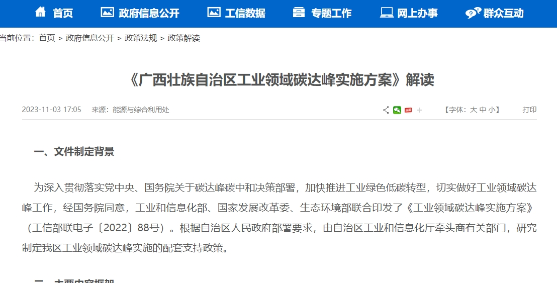 近日,廣西壯族自治區(qū)工業(yè)和信息化廳與廣西壯族自治區(qū)發(fā)展和改革委員會(huì)、廣西壯族自治區(qū)生態(tài)環(huán)境廳聯(lián)合印發(fā)了《廣西壯族自治區(qū)工業(yè)領(lǐng)域碳達(dá)峰實(shí)施方案》