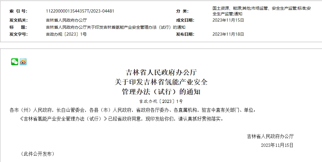 氫啟未來(lái)網(wǎng)獲悉,11月18日,吉林省人民政府辦公廳發(fā)布關(guān)于印發(fā)《吉林省氫能產(chǎn)業(yè)安全管理辦法(試行)》的通知。