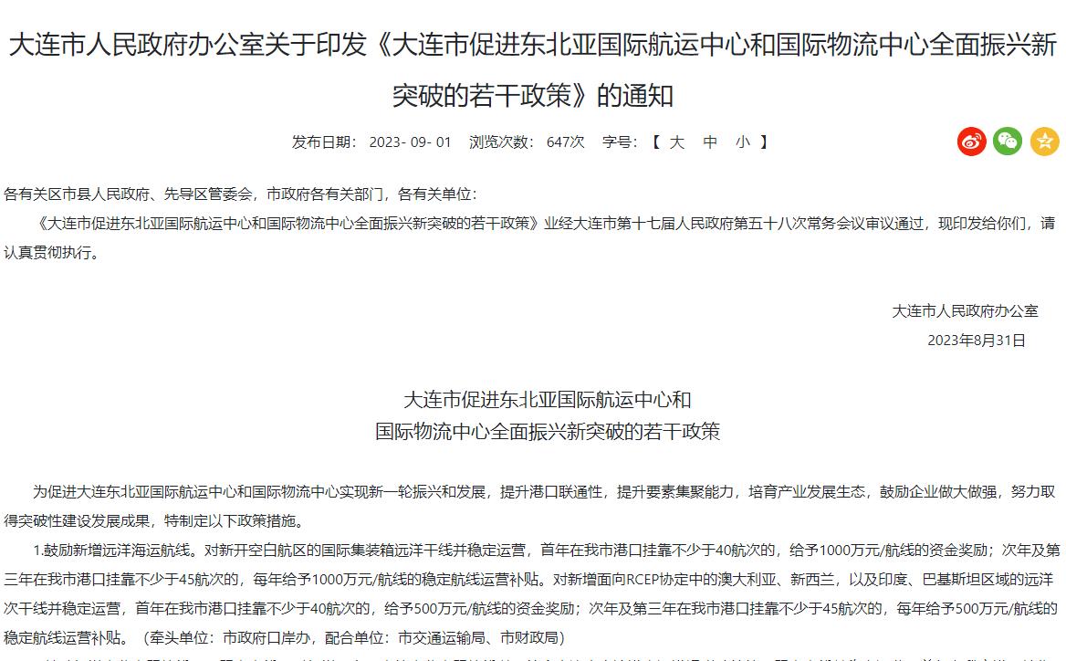 9月1日,大連市人民政府發布關于印發《大連市促進東北亞國際航運中心和國際物流中心全面振興新突破的若干政策》的通知。