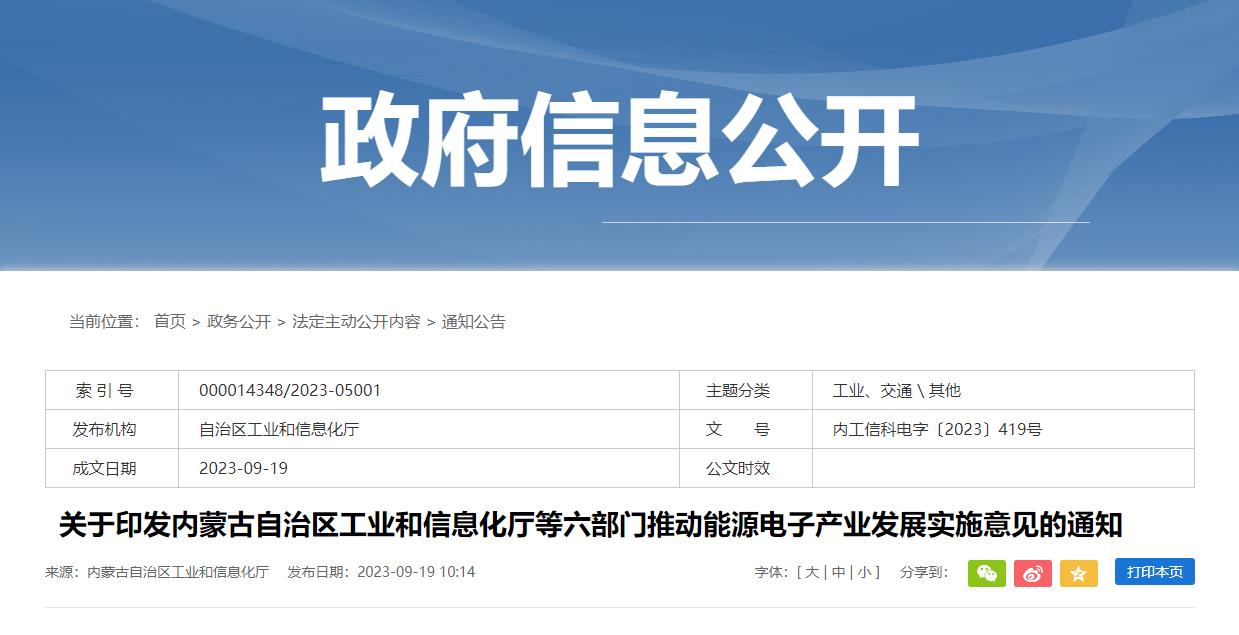 《內蒙古自治區工業和信息化廳等六部門關于推動能源電子產業發展實施意見》