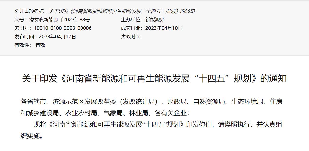 氫啟未來網獲悉,4月17日,河南省發展和改革委員會、河南省財政廳、河南省自然資源廳、河南省生態環境廳、河南省住房和城鄉建設廳、河南省農業農村廳、河南省氣象局、河南省林業局聯合印發《河南省新能源和可再生能源發展“十四五”規劃》