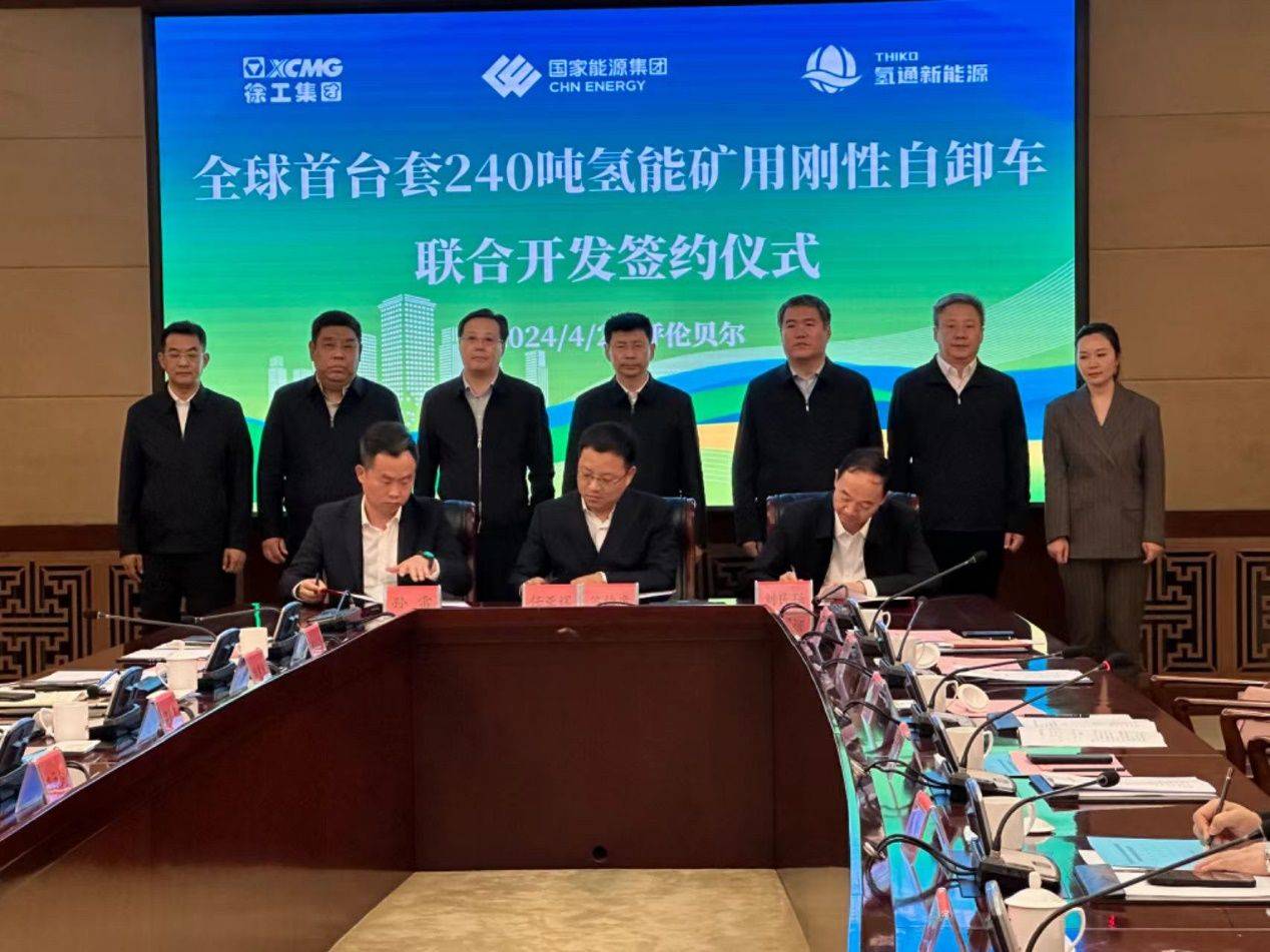 2024年4月24日下午,國家能源集團、徐工集團、氫通新能源三方在呼倫貝爾舉行全球首臺套240噸氫能礦用剛性自卸車聯合開發簽約儀式。國能寶日希勒能源有限公司總經理劉民強、徐州工程機械集團有限公司黨委副書記、集團總經理孫雷、氫通(上海)新能源科技有限公司董事長兼CEO任亞輝分別代表三方進行簽約。呼倫貝市市委副書記、市長及永乾、市委常委、常務副市長胡兆民、市政府秘書長徐景睿、市工信局局長魏云鵬、市能源局局長何偉...