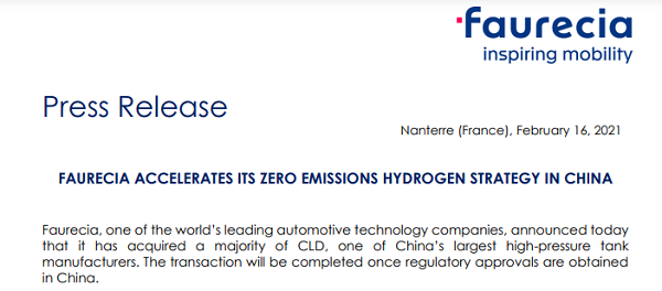?2月16日,佛吉亞(FAURECIA)宣布已收購(gòu)中國(guó)最大高壓氣瓶公司斯林達(dá)(CLD)大部分股權(quán),交易將在獲得相關(guān)部門審批后完成。截止目前,雙方并未透露具體的收購(gòu)金額。根據(jù)了解,此次收購(gòu)為絕對(duì)控股,雙方將為中國(guó)市場(chǎng)開(kāi)發(fā)生產(chǎn)III型和IV型儲(chǔ)氫罐。