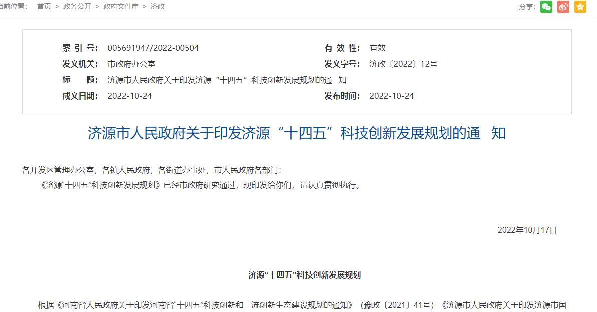 氫啟未來網獲悉,10月24日,濟源市人民政府發布關于印發濟源“十四五”科技創新發展規劃的通知