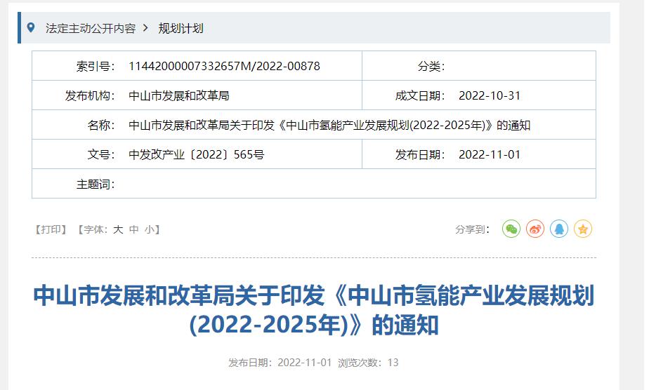 氫啟未來網獲悉,11月1日,中山市發展和改革局公布關于印發《中山市氫能產業發展規劃(2022-2025年)》的通知。