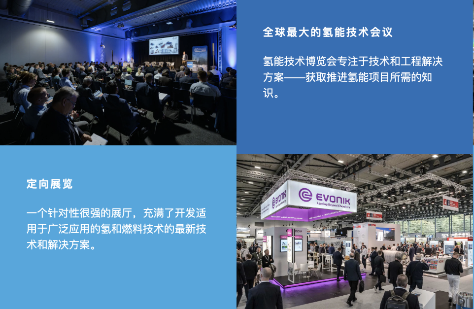歐洲氫能技術博覽會是全球最大的提供氫能技術、材料、組件和工程解決方案的供應商展覽會,從制氫、氫能發(fā)電、儲運、加氫站及氫燃料電池汽車應用的設備貿易專場活動,重點關注低碳氫氣生產、高效儲存和分配以及各種固定和移動應用的解決方案和創(chuàng)新。