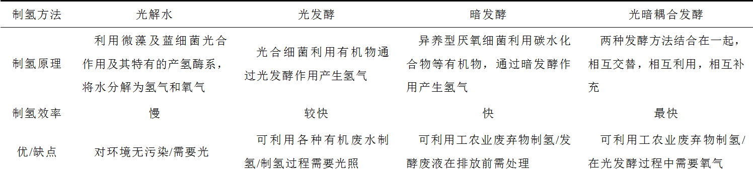 生物制氫的主要途徑有光解水、光發(fā)酵、暗發(fā)酵制氫和光暗偶聯(lián)發(fā)酵。幾種生物制氫方法的比較見表1。生物制氫有許多優(yōu)點。與傳統(tǒng)的物理化學(xué)方式 相比之下,更節(jié)能、可再生、低消耗。這是未來大規(guī)模制氫的重要途徑。