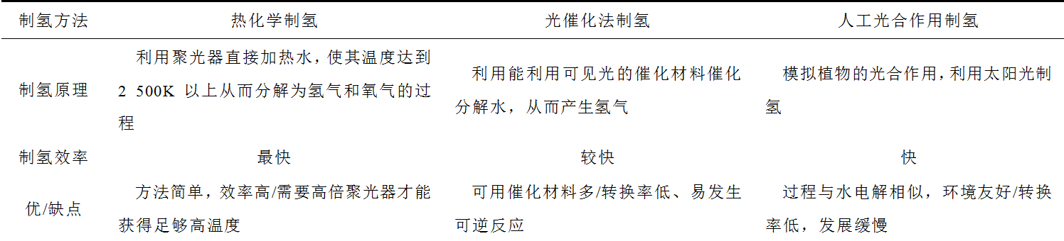 最近,研究人員正專注于開發(fā)利用太陽能和其他可再生能源生產(chǎn)氫氣的新技術(shù)。目前,太陽能制氫技術(shù)的主要實現(xiàn)途徑有光化學(xué)制氫、光催化制氫、人工光合制氫等。幾種太陽能制氫方法的比較如表2所示。