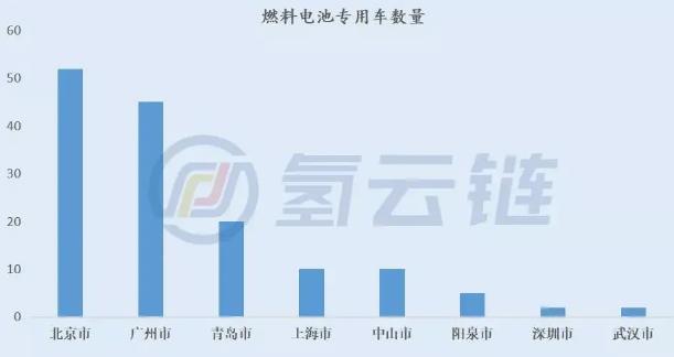 從省級區域分布來看,146輛燃料電池專用車分布在6個省8市,其中北京市以52輛排名第一,廣東省廣州市以45輛排名第二;山東省青島市以20輛排名第三;上海市與廣東中山市均有10輛車,并列第四。山西省陽泉市、廣東省深圳市、湖北省武漢市分別有5輛、2輛、2輛上險。