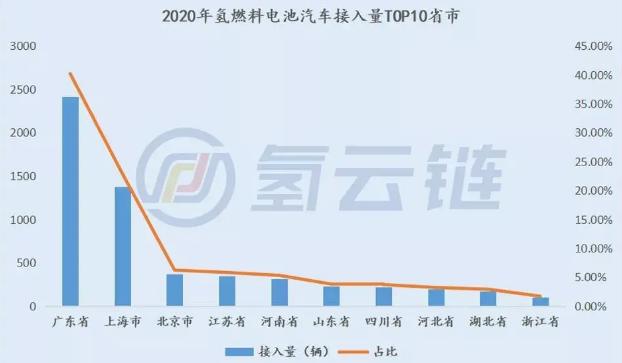 據新能源汽車國家監測和管理平臺最新數據統計,截至2020年底,已累計接入氫燃料電池汽車6002輛;這6002輛車分布在17個省份。其中,廣東省接入氫燃料電池汽車2415輛,在全國氫燃料電池車輛接入量的占比達40.2%;排在第一位。其次是上海市氫燃料電池車輛接入量分別為1376輛,占比達22.9%。北京市以370輛排名第三;江蘇省以348輛,排名第四;值得注意的是,排名前10位的省市(河南省、山東省、四川省、河北省、湖北省、浙江省排名依次遞減)氫燃料電池汽車接入量均在100輛以上。