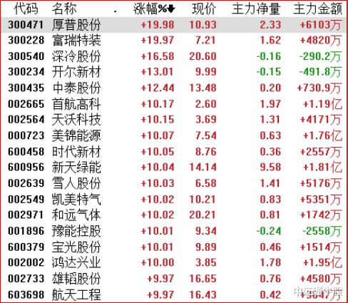 厚普股份開盤后早早地20cm漲停封板,富瑞特裝、美錦能源、雄韜股份、全柴動力、新天綠能、雪人股份等10多只相關概念股漲停封板。久違地漲停潮又回來了,比起上周的半導體有過之而無不及。