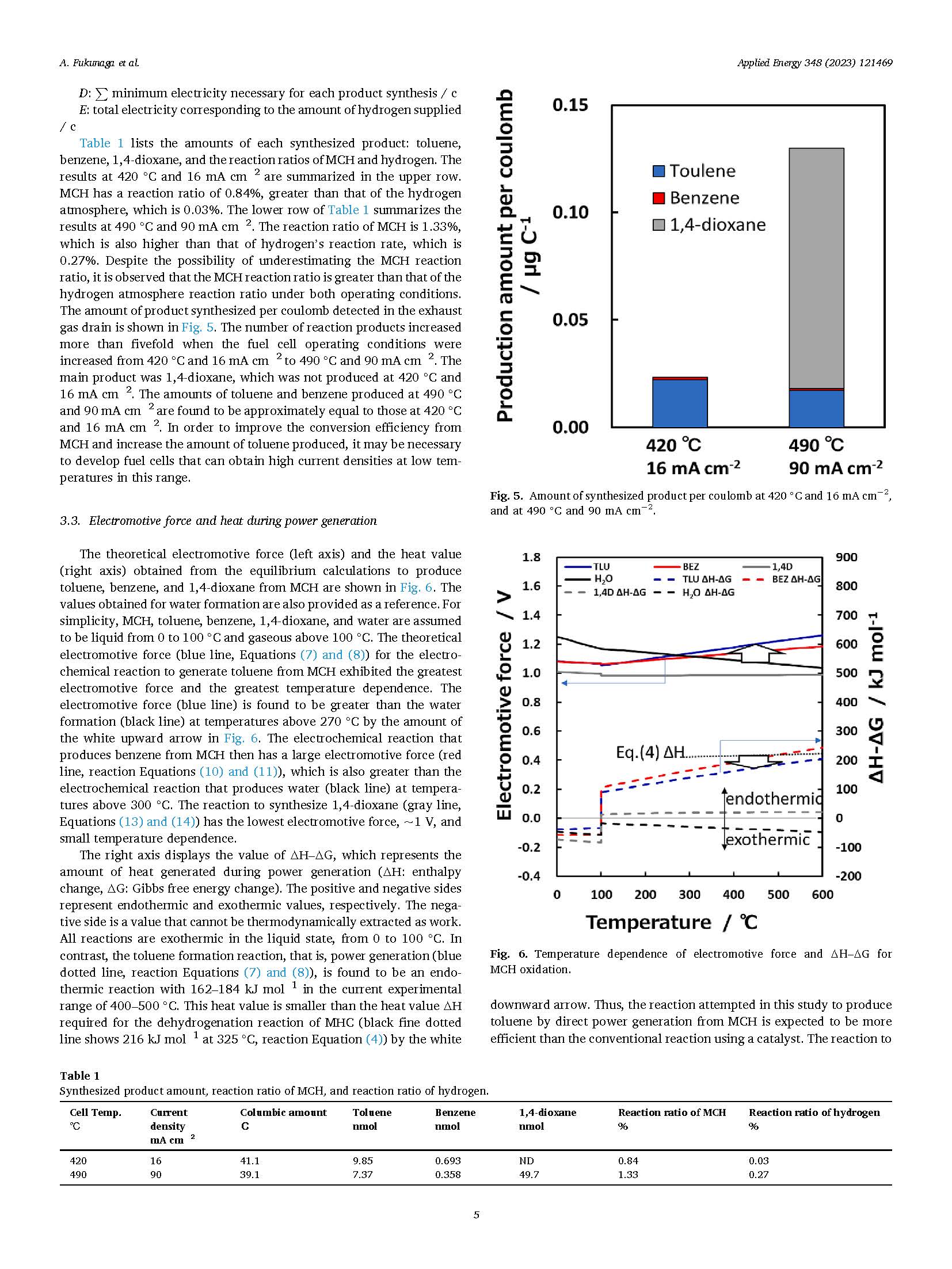 早稻田大學的研究小組還設(shè)法在燃料電池中同時進行兩個過程:有機氫化物的脫氫(吸熱反應(yīng))和發(fā)電(放熱反應(yīng))。為了實現(xiàn)這一目標,他們采用了陽極支持的SOFC,并嚴格控制了工作溫度和碳沉積條件。實驗結(jié)果顯示,甲苯與苯的生產(chǎn)比達到了94:6。