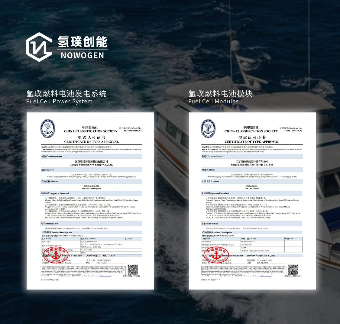 2024年6月18日,氫璞創(chuàng)能旗下子公司江蘇耀揚(yáng)新能源科技有限公司自主研發(fā)的200kW船用燃料電池發(fā)電系統(tǒng)(OCEAN-200),成功獲得了中國(guó)船級(jí)社(CCS)型式認(rèn)可,填補(bǔ)了國(guó)內(nèi)單系統(tǒng)200kW級(jí)船用燃料電池系統(tǒng)的空白。