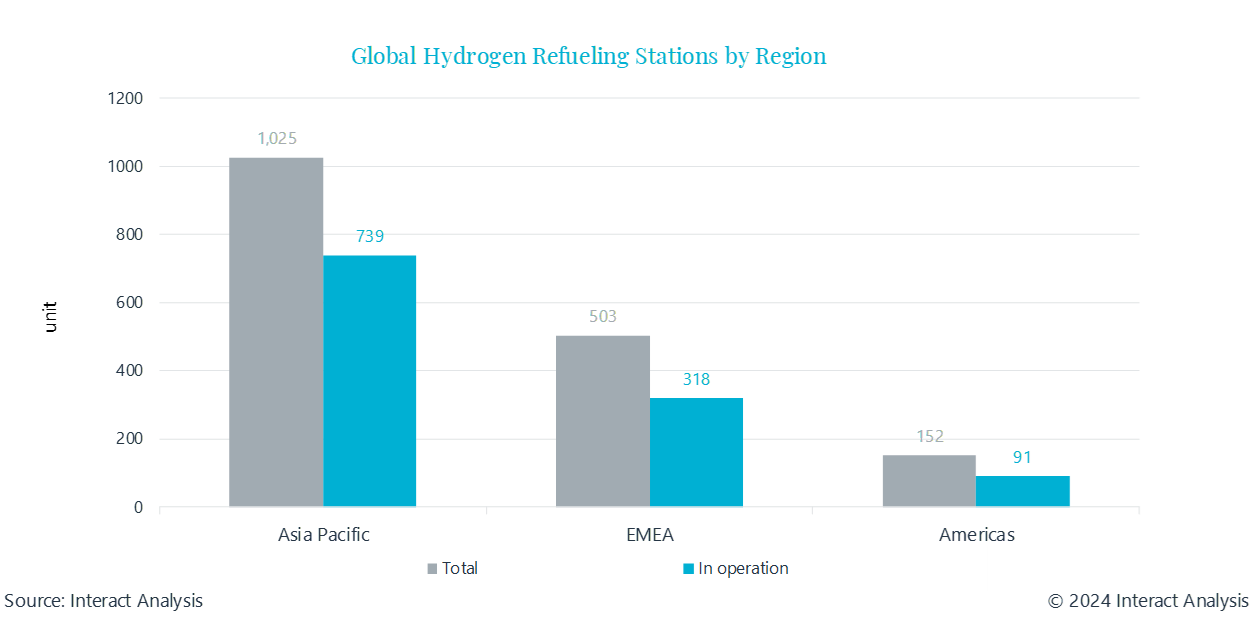 近年來,隨著氫能交通應(yīng)用的推廣落地,加氫站建設(shè)日益緊迫。Interact Analysis 持續(xù)追蹤全球加氫站部署,據(jù)統(tǒng)計(jì),截至2024年上半年,全球加氫站部署達(dá)到1,680座(含建成、在建及規(guī)劃),其中1,148座已建成投運(yùn)。