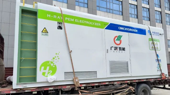 2024 年 10 月 14 日,上海氫銳科技有限公司為中集安瑞科(廊坊)能源裝備集成有限公司定制的撬裝一體化PEM電解水集裝箱系統在進行了168小時廠內測試驗收后,即將啟程發運至廣東廣晟氫能有限公司。