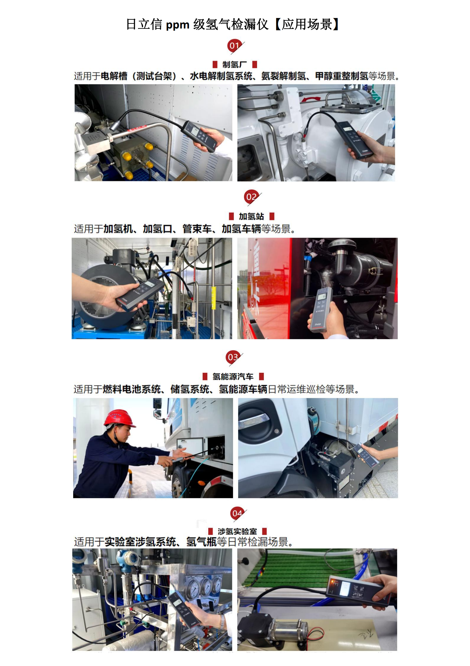 廣泛應用于制氫站、加氫機、燃料電池生產線、氫能源車輛運維、涉氫實驗室等場景,精準檢測電堆、儲氫瓶、閥門等核心部件泄漏。
