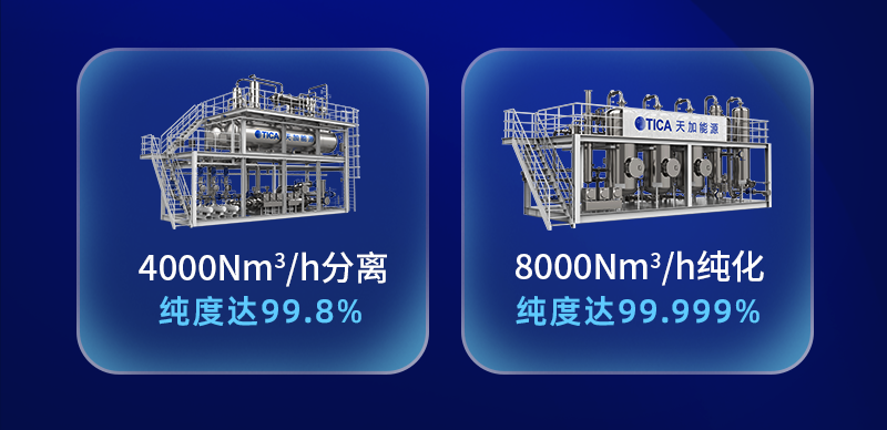 此次發布的兩款裝置具備多項行業領先特性:4000Nm3/h分離裝置氫氣純度達99.8%,適配1000Nm3/h堿水制氫電解槽,采用標準化模塊化設計,可大幅縮短制造與安裝周期,同時配備安全儀表系統(SIS),滿足化工裝置安全穩定運行需求;8000Nm3/h純化裝置將氫氣純度提升至99.999%,露點低至-70℃,適配ALK、PEM等多種制氫工藝,基于歷史數據的自動尋優控制策略,降低能耗。