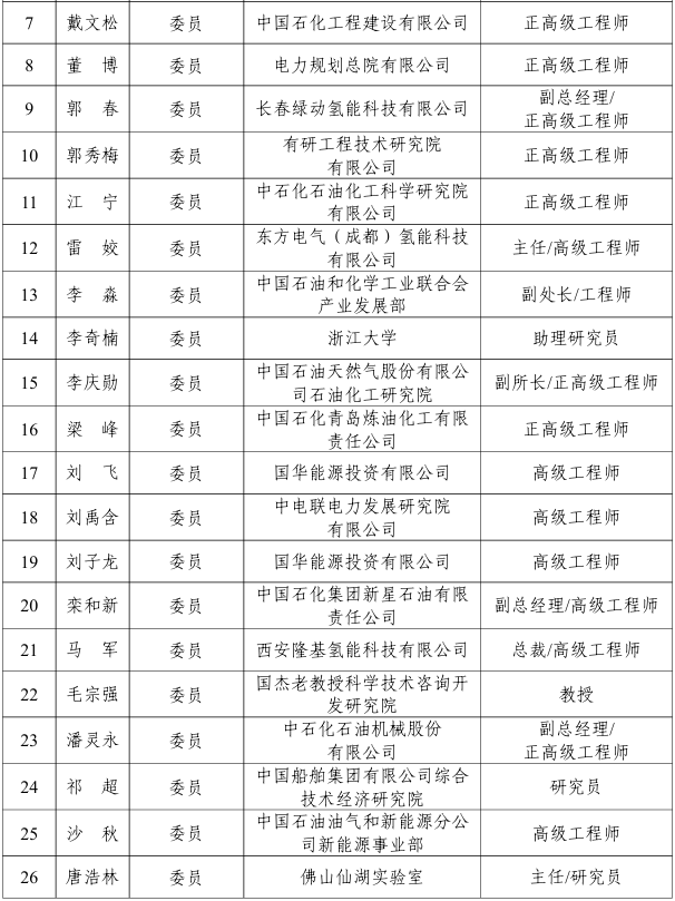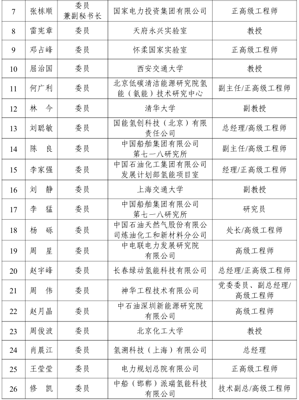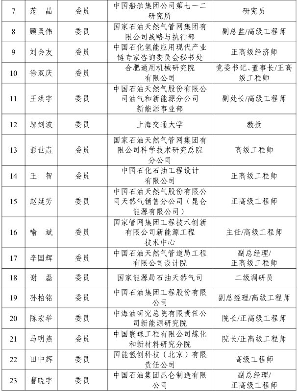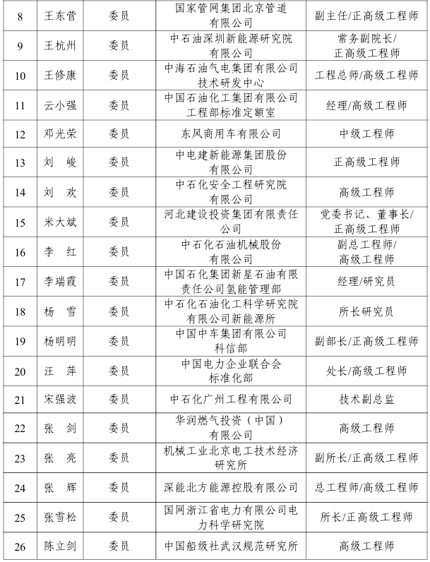 能源行業氫能應用標準化技術委員會編號為NEA/TC 51,負責能源行業氫能應用標準體系研究,具體承擔氫加注、氫基燃料、氫電協同、綠氫煉油等氫能應用方面的標準化工作,第一屆能源行業氫能應用標準化技術委員會由40名委員組成,委員名單如下: