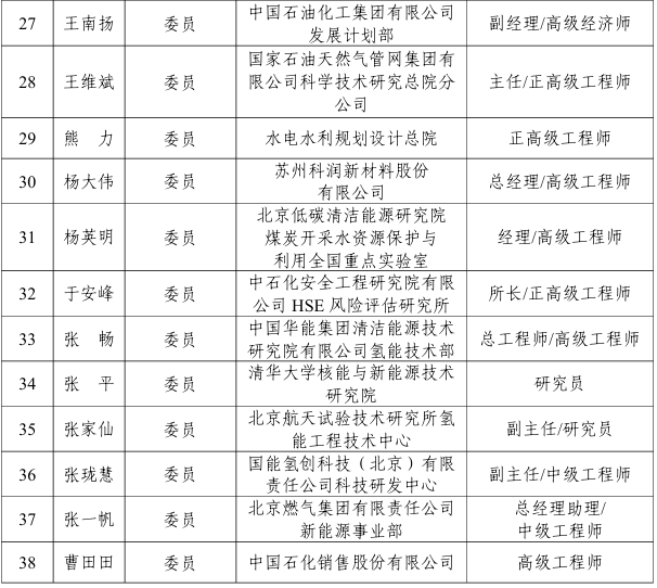 能源行業氫能制取標準化技術委員會編號為NEA/TC 49,負責能源行業氫能制取標準體系研究,具體承擔電解水制氫、可再生能源制氫、光解水制氫、化石能源制氫、其他制氫、天然氫和氫分離與提純等氫能制取方面的標準化工作,第一屆能源行業氫能制取標準化技術委員會由38名委員組成,委員名單如下:
