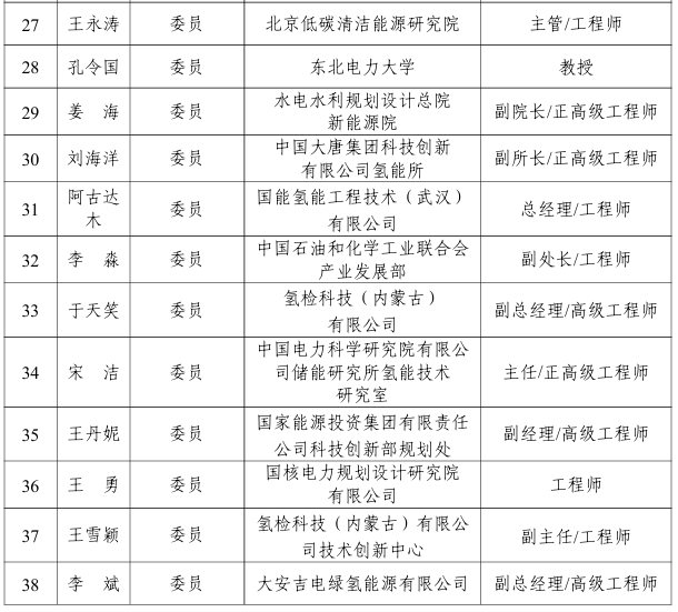 能源行業氫能基礎與通用標準化技術委員會編號為NEA/TC 48,負責能源行業氫能基礎與通用標準體系研究,具體承擔氫能基礎共性要求、術語定義、氫品質、評價體系等方面的標準化工作,第一屆能源行業氫能基礎與通用標準化技術委員會由38名委員組成,委員名單如下:
