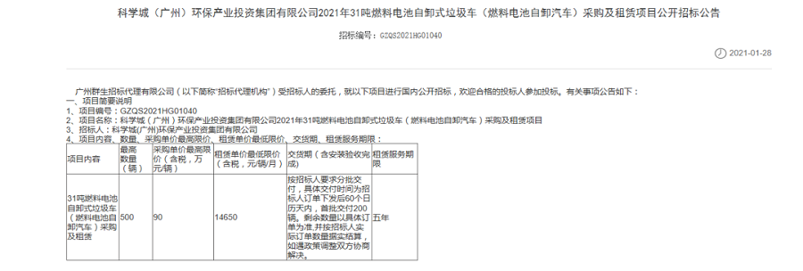 2月4日,氫云鏈從廣州群生招標代理有限公司官網獲悉,科學城(廣州)環保產業投資集團有限公司發布31噸燃料電池自卸式垃圾車(燃料電池自卸汽車)采購及租賃項目招標公告。