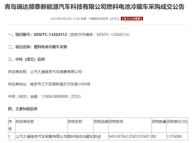 對比今年的另一大單,青島瑞達順泰新能源汽車科技有限公司采購的80輛燃料電池冷藏車項目,于2月22日公告上汽大通中標,中標金額1.1億,單價137.6萬元。