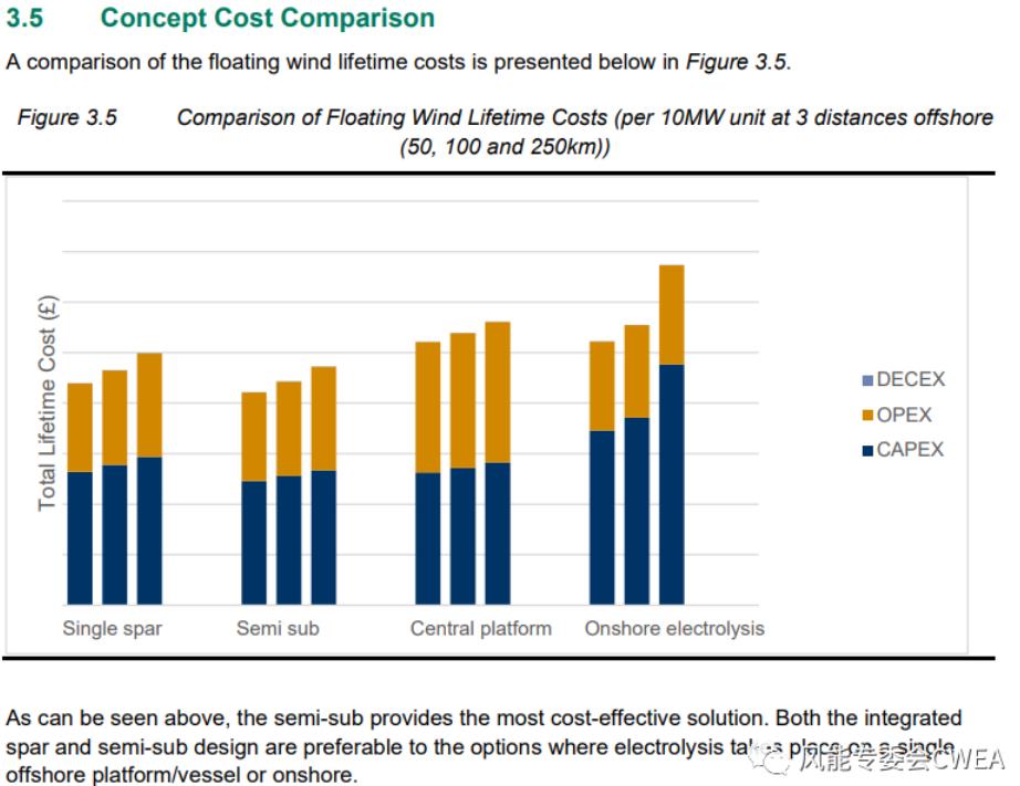 英國另一個名為dubbed Dolphyn 的氫能島項目,計劃使用漂浮式風電配合電解槽來進行制氫,分別采用一臺2MW和10MW的漂浮式風機。Dolphyn母公司ERM進行的一項分析顯示,四種不同裝置的全生命周期成本各不不同。