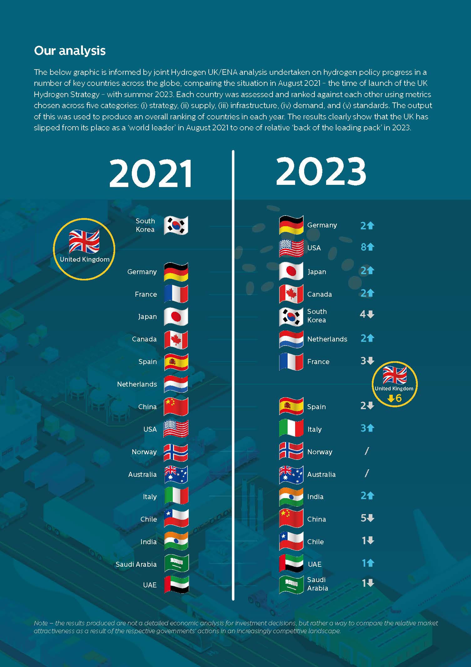 根據能源網絡協會(ENA)和英國氫能公司的最新報告指出,英國的氫政策進展在2021年排名世界第二,然而到了2023年已經下滑至第八位。盡管其低碳氫生產目標翻了一番,達到10GW,但在最終確定政策和支持機制方面,英國的進展緩慢,時間表不斷延期,沒有重大項目進入最終投資決策(FID)。
