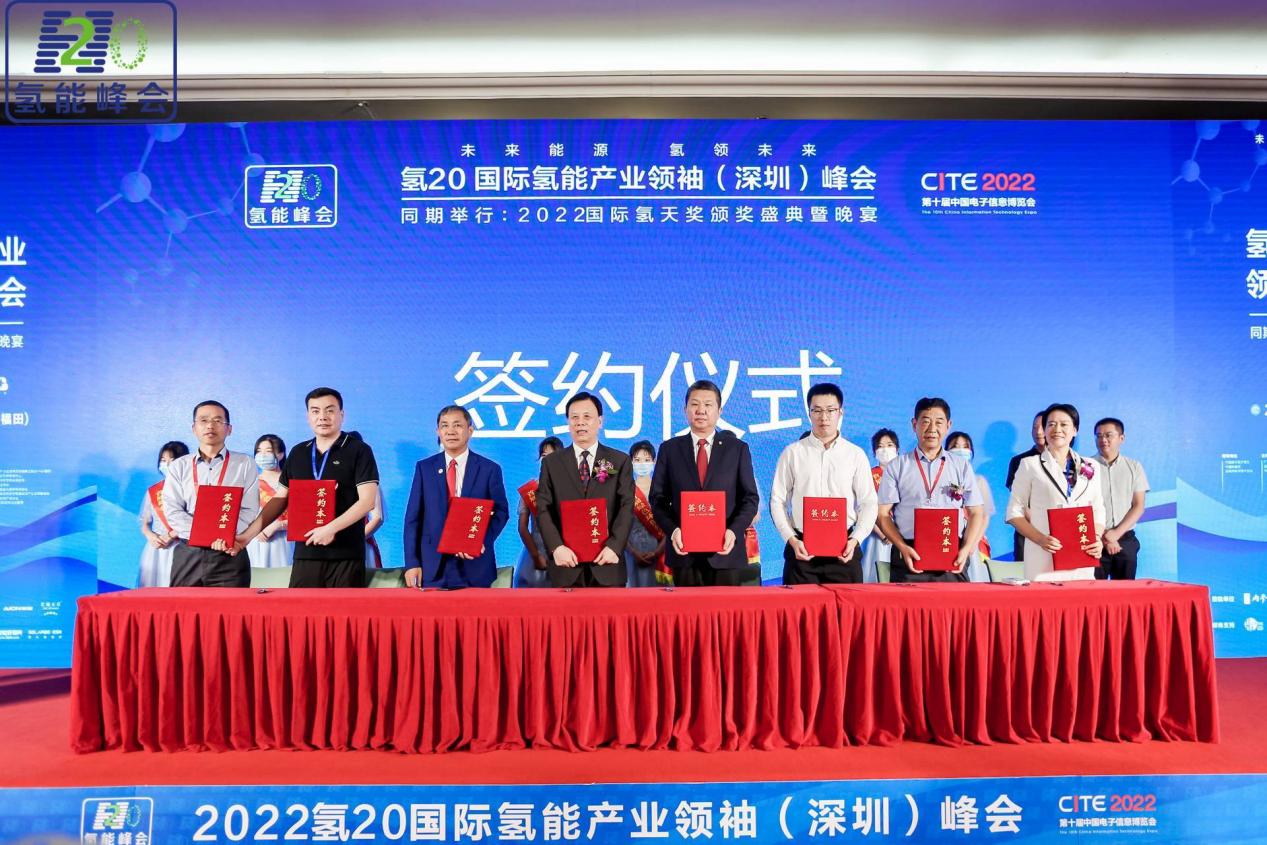 包括正威集團與氫20組委會簽約,雙方就參加峰會項目孵化、投資、氫能園區建設等領域進行了合作簽約;深圳前海恒邦股權投資有限公司、江蘇省鹽城市射陽港開發區管委會雙方就射陽港-深圳氫能產業發展基金項目簽約;城投氫能與海卓科技、慈溪市長三角智能新能源汽車雙創產業化中心三方簽約,三方將協議推廣燃料電池應用;城投氫能、時代氫源,雙方就質子膜生產進行了合作簽約;協鑫集團、科谷集團雙方就綠電制氫進行了合作簽約;隆基綠能、科谷研究院雙方就儲能項目進行了簽約;華瀛天然氣、科谷研究院雙方就LNG 制氫項目簽約;航天氫能科技 - 科谷研究院 氫能檢測方向簽約;科谷研究院 - 佛山仙湖實驗室 氫能項目簽約;科谷集團、上海舜華雙方就加氫站建設項目進行簽約;科谷集團、郴州市湘南國際物流園雙方簽署了氫能產業戰略合作協議。