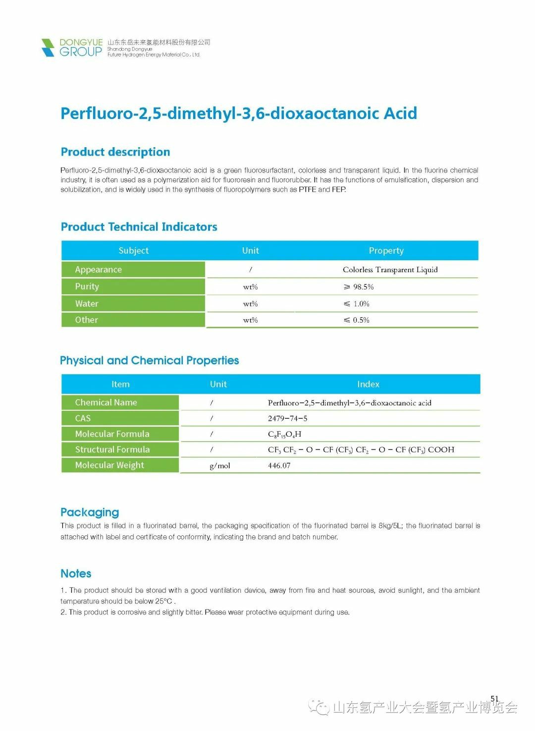 從2020年開始,公司逐步確立了“以全氟磺酸樹脂為代表的高功能含氟聚合物產(chǎn)品集群為中心、以六氟環(huán)氧丙烷代表的含氟精細化學品集群為依托、以燃料電池膜含氟功能膜產(chǎn)品集群為導向”的三個產(chǎn)品集群互相支撐的發(fā)展路線。