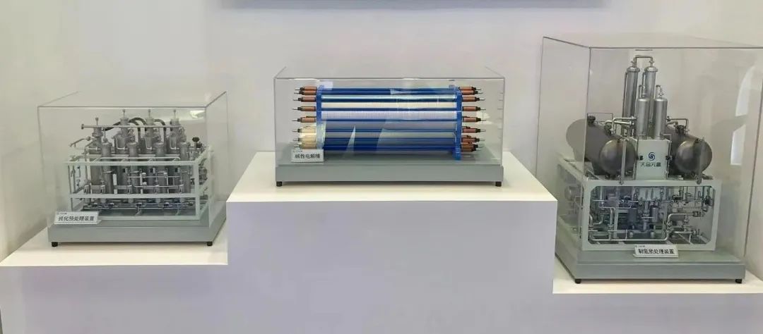 在氫能產業鏈上游,綠氫的高效制取一直備受關注。此次天合元氫展出的天擎系列,涵蓋堿性電解水制氫設備、變壓器、整流柜、低壓配電系統、電解氣液處理器和氫氣純化裝置及其他輔助設備,具備高效、綠色、環保等特點。通過全面優化產品性能,增加氫能產出,降低單位制氫成本(LCOH)。
