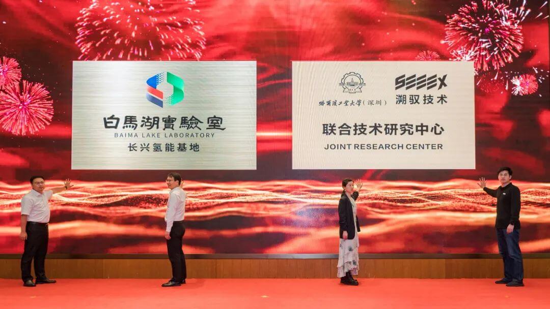 活動現(xiàn)場,煤山鎮(zhèn)黨委書記陸偉杰與白馬湖實驗室常務(wù)副總經(jīng)理、副主任范海東,哈爾濱工業(yè)大學(xué)(深圳)校方代表與溯馭技術(shù)董事長董震博士一道上臺,共同為白馬湖實驗室長興氫能基地和哈爾濱工業(yè)大學(xué)(深圳)溯馭技術(shù)聯(lián)合技術(shù)研究中心進行了揭牌。