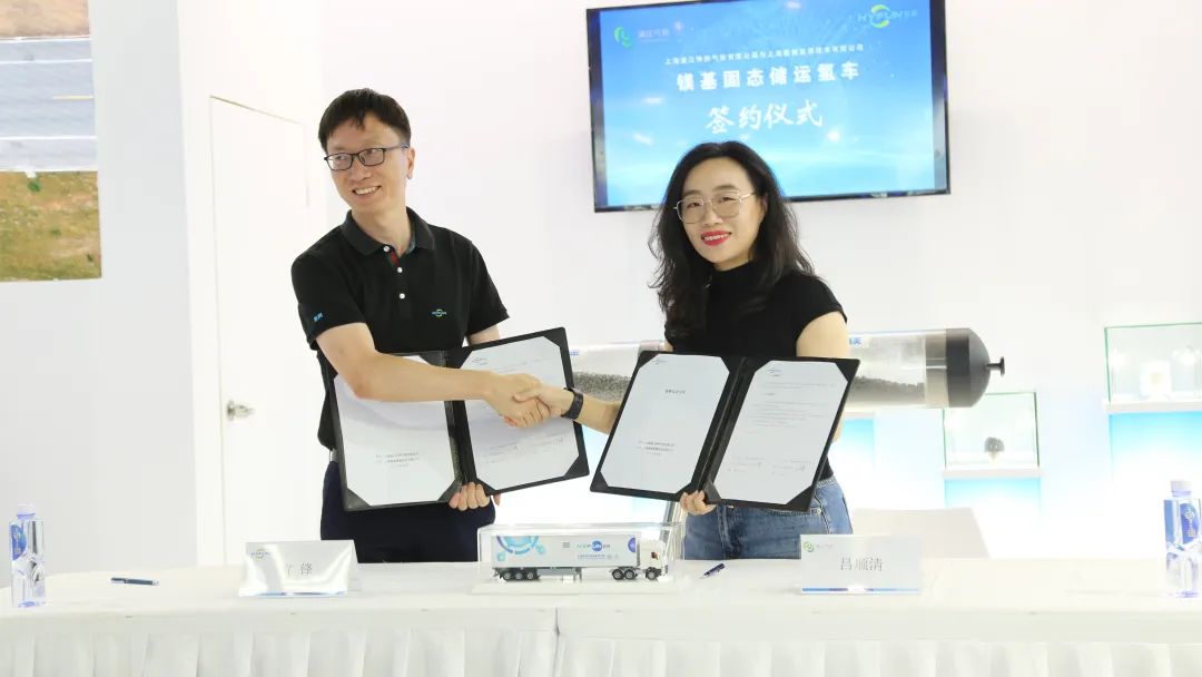 在這場氫能界的盛會上,上海氫楓能源技術有限公司(以下簡稱:氫楓能源)與上海浦江特種氣體有限公司(以下簡稱:浦江氣體)達成了一項重大合作,雙方簽署了批量鎂基固態儲運氫車采購協議。