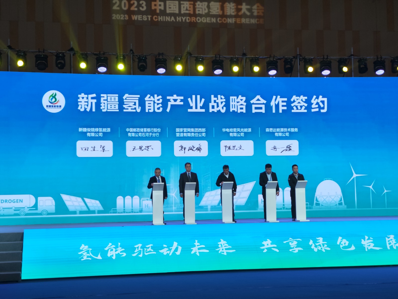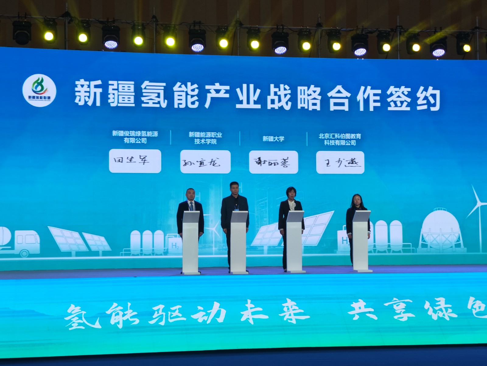 為進(jìn)一步推動(dòng)新疆氫能示范項(xiàng)目的落地實(shí)施,促進(jìn)資源共享、優(yōu)勢互補(bǔ)、互惠互利、合作共贏,主題演講后,新疆氫能產(chǎn)業(yè)發(fā)展聯(lián)盟與中關(guān)村氫能與燃料電池技術(shù)創(chuàng)新產(chǎn)業(yè)聯(lián)盟、深圳市氫能與燃料電池協(xié)會(huì)簽訂戰(zhàn)略合作協(xié)議;中國郵政儲(chǔ)蓄銀行股份有限公司石河子分行與新疆俊瑞綠氫能源有限公司簽訂新疆氫能產(chǎn)業(yè)發(fā)展聯(lián)盟會(huì)員單位戰(zhàn)略合作協(xié)議;新疆大學(xué)與新疆能源職業(yè)技術(shù)學(xué)院、新疆俊瑞綠氫能源有限公司與北京匯科伯圖教育科技有限公司簽訂產(chǎn)教融合共同體協(xié)議。