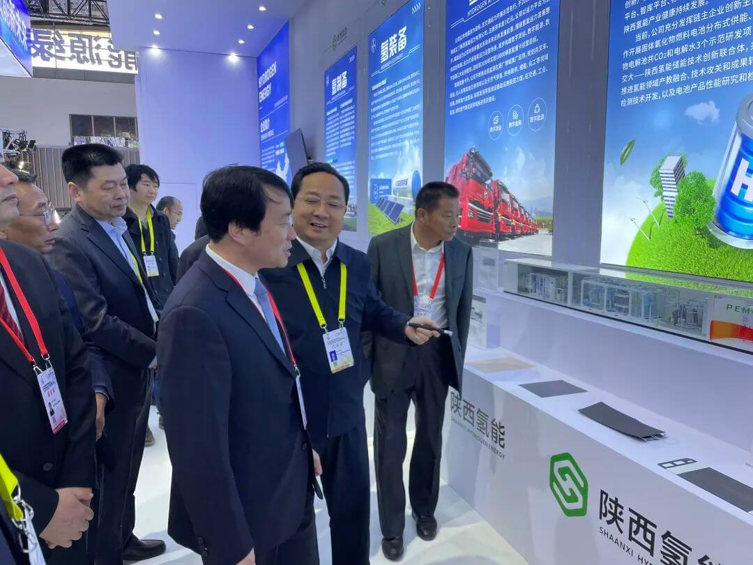 絲博會已成功舉辦6屆,為深度融入共建“一帶一路”大格局,打造內陸改革開放高地,推動形成以國內大循環為主體、國內國際雙循環相互促進的新發展格局發揮了重要平臺作用,取得了豐碩合作成果。本屆絲博會以“經貿拓展·互聯互通·互利共贏”為主題,在西安國際會展中心設置6個展區,將進一步提升東西部經貿和技術交流水平,加快國內經濟雙循環。應陜西省榆林市管委會、陜西氫能產業發展有限公司(以下簡稱陜西氫能)邀請,國氫科技攜自主品牌“斯”系列關鍵材料部件、“氫騰”燃料電池、“氫涌”PEM電解水制氫設備等7件產品分別在“開放平臺展”和“先進制造業展”雙展區展出,吸引了行業內外觀眾的關注。